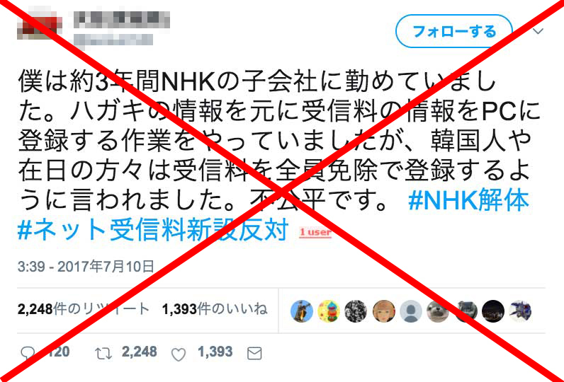 「韓国人や在日の方々はNHK受信料を全員免除」はデマ Twitterで拡散