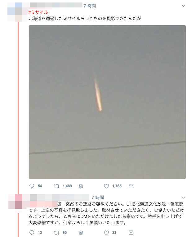 9月15日、北朝鮮からミサイルが発射されたが、画像付きで「北海道を通過したミサイルらしき物を撮影」というものがツイッターで出回る。