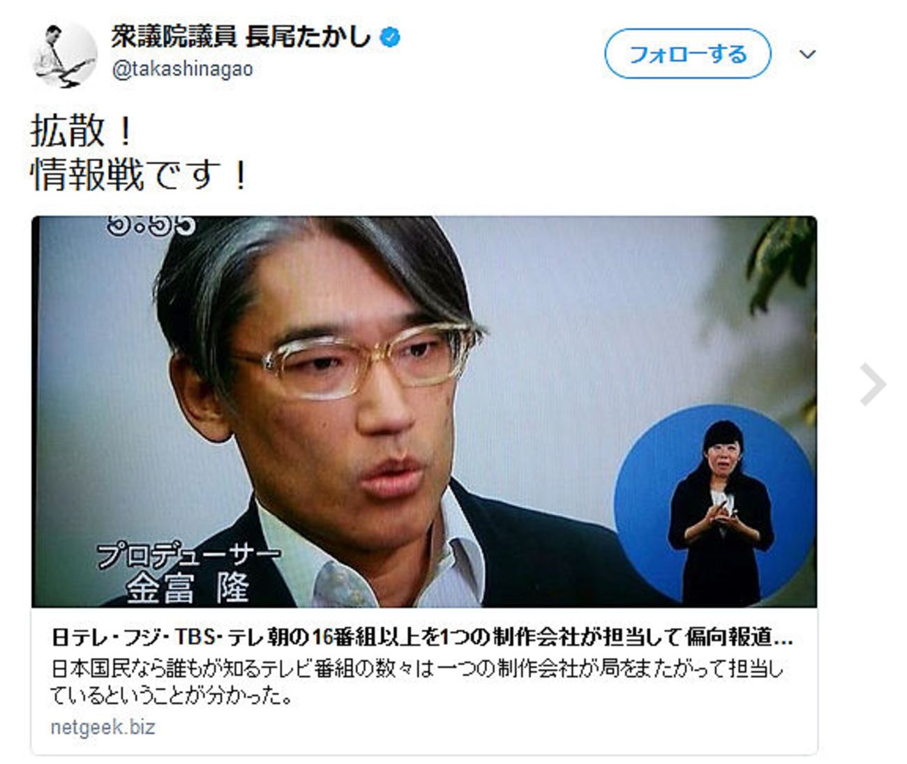 自民党の長尾敬衆院議員がデマ系バイラルメディア「netgeek」の記事を元にツイート。しかし、元エントリーは真実でないため、長尾敬衆院議員は謝罪した。 (ミラー)問題のツイートはこれ(現在は削除済み) (問題ツイートの魚拓)netgeekの問題エントリー ・政治41日テレ・フジ・TBS・テレ朝の16番組以上を1つの制作会社が担当して偏向報道やりたい放題。日本は乗っ取られた(リンク先は魚拓)このヘッ...