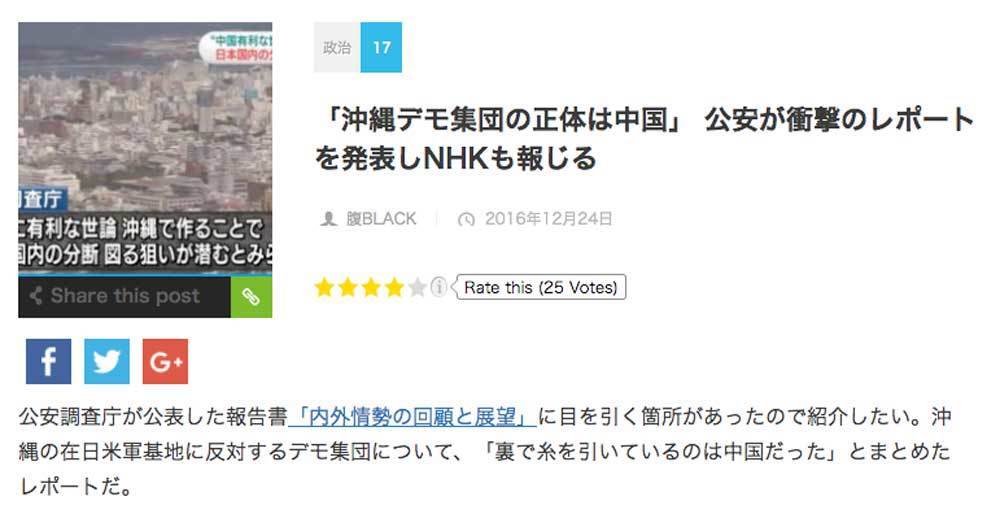 「『沖縄デモ集団の正体は中国』公安が衝撃のレポートを発表しNHKも報じる」との記事(2016/12/24)